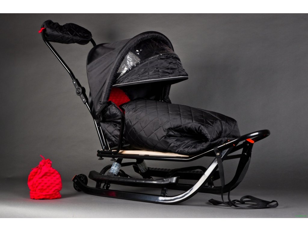 Detské sánky odpružené s fusakom MINKY strieškou a čiapkou čierno-červené