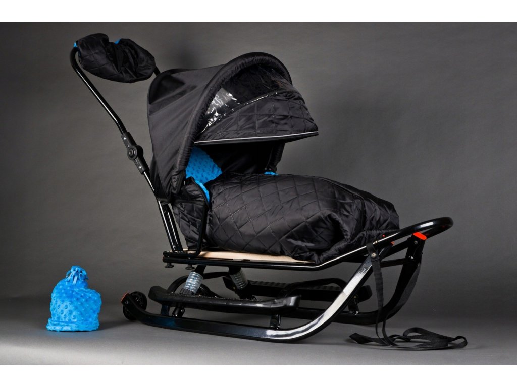 Detské sánky odpružené s fusakom MINKY strieškou a čiapkou Čierno-modré